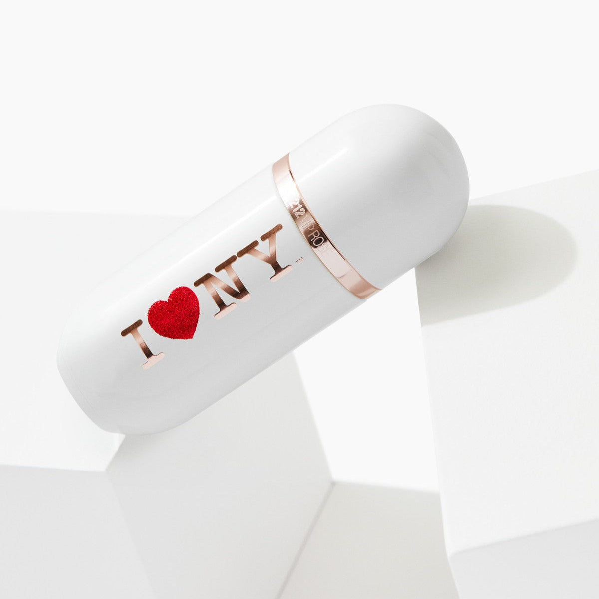 The iconic 212 VIP Rosé bottle is transformed with a glossy white exterior, featuring the classic I Love NY logo in metallic pink with a dazzling red glitter heart.