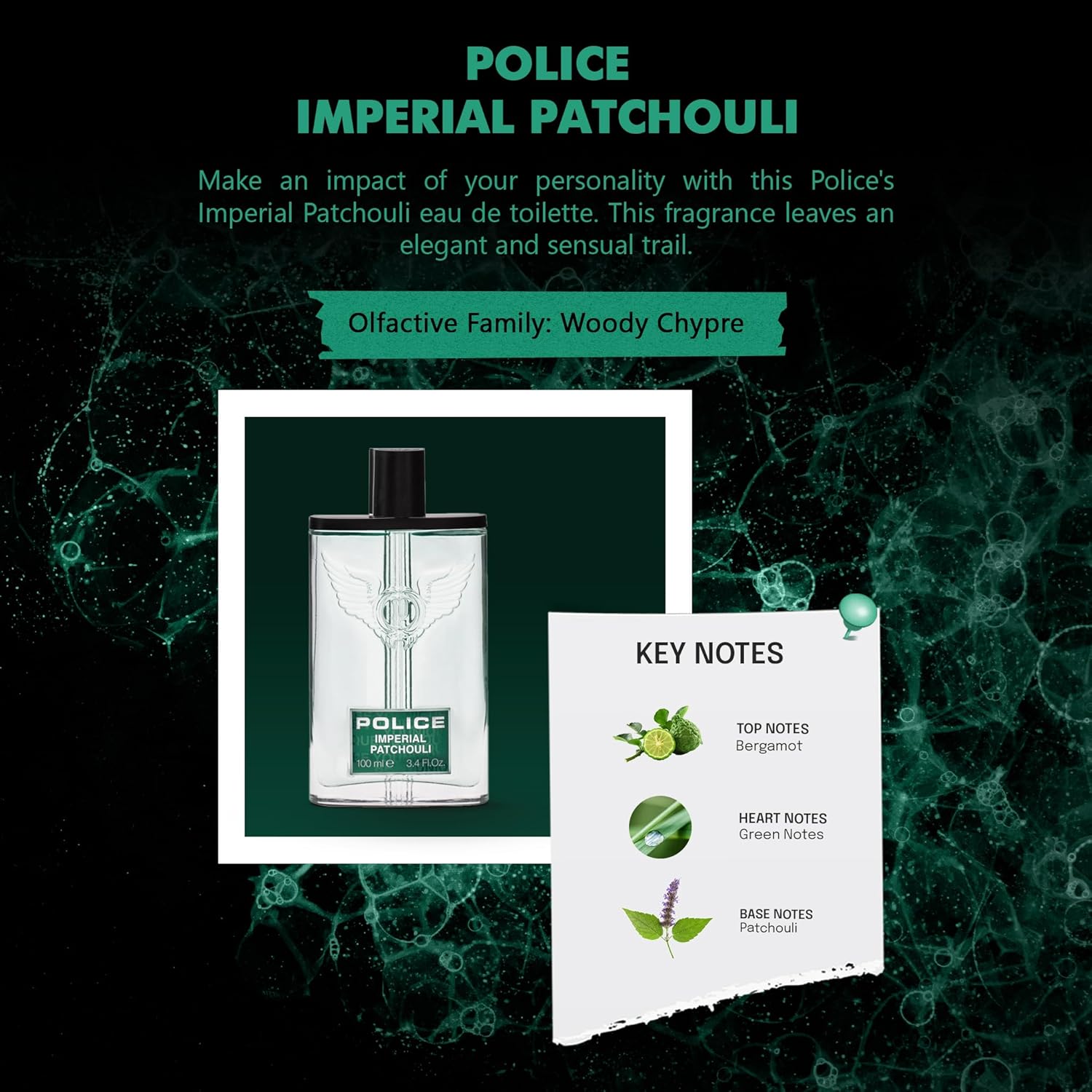 Imperial Patchouli by Police is a Woody Chypre fragrance for men. Imperial Patchouli was launched in 2015. The fragrance opens with the fresh notes of mandarin and bergamot, further enriched with aromatic and slightly spicy touches. The floral and soft heart is underpinned by a warm and embracing base note, made of a noble bois accord, and dominated by the essence of patchouli.