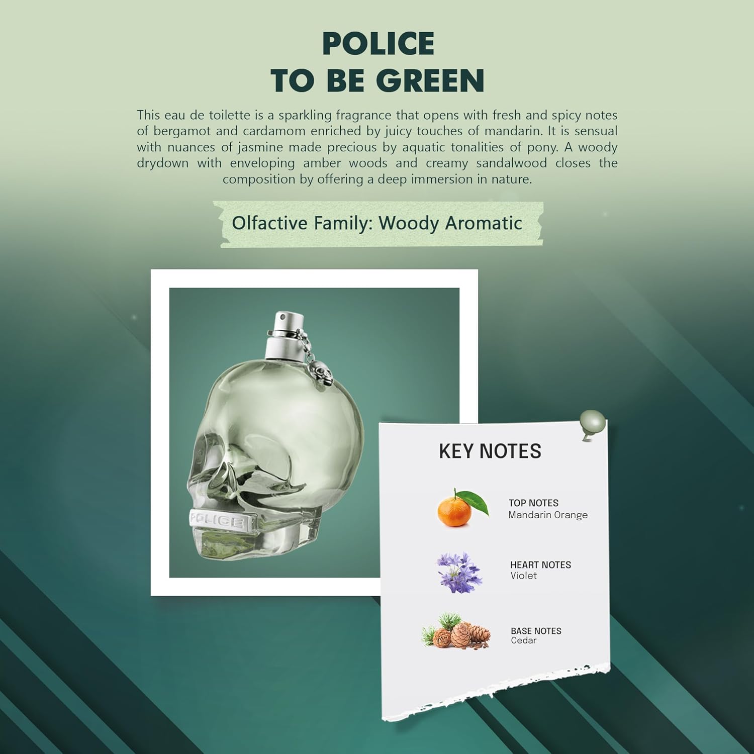 A sparkling fragrance that opens with fresh and Spicy notes of Bergamot and Cardamom enriched by juicy touches of Mandarin. The heart, an elegant Floral bouquet, is sensual with nuances of Jasmine made precious by aquatic tonalities of Pony. A Woody dry down, with enveloping Amber Woods and creamy Sandalwood, closes the composition by offering a deep immersion in the nature. To Be Green enters a NEW ERA divesting the skull of its usual colorful and lively look to remain in its ESSENTIAL form.